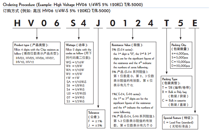 根据功能用途不同表达型号方式也有区别,如厚声的高压厚膜晶片电阻,型号以字母开头HV03, HV05, HV06, HV07,HV10, HV12。
