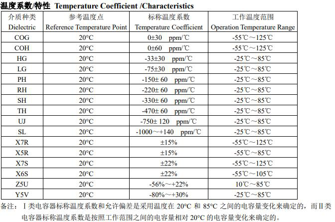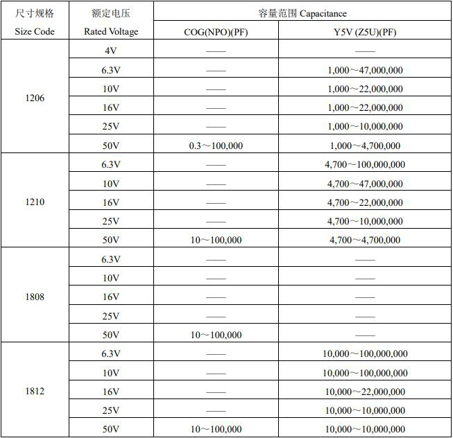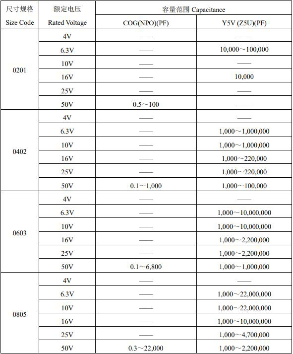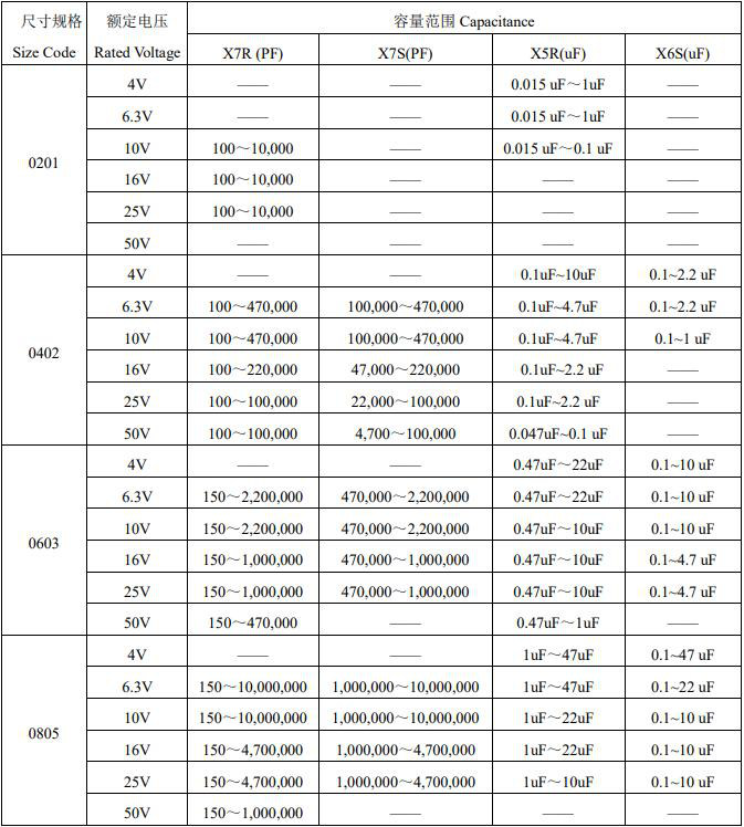 风华贴片电容参数选购图表如下